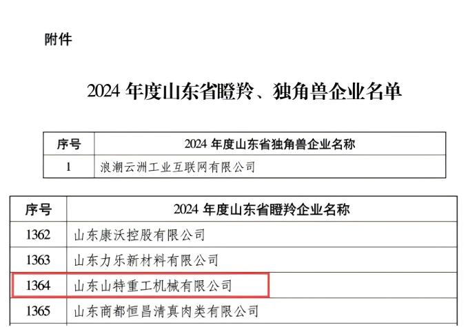 近日,山東省工業(yè)和信息化廳發(fā)布《關(guān)于公布2024年度山東省瞪羚、獨(dú)角獸企業(yè)的通知》,山特重工憑借著卓越的創(chuàng)新能力、高速的成長(zhǎng)態(tài)勢(shì),成功獲評(píng)2024年度“山東省瞪羚企業(yè)”。